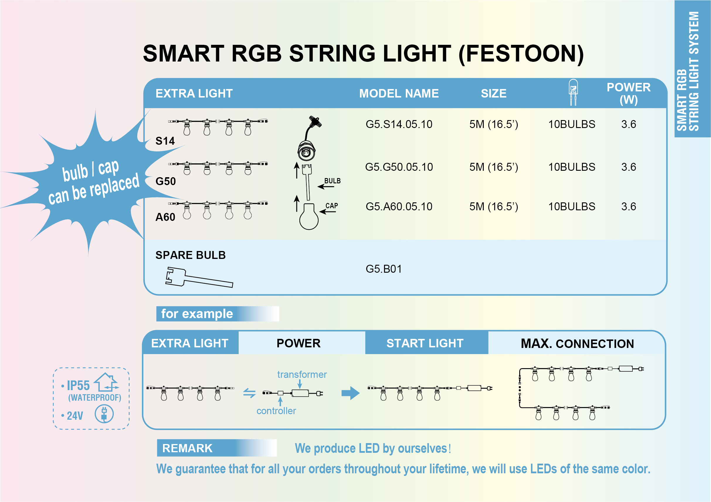 * Basic product: straight-line type, S14 bulb-10bulbs/5M(16.5’); G50 bulb-10bulbs/5M(16.5’); A60 bulb-10bulbs/5M(16.5’);