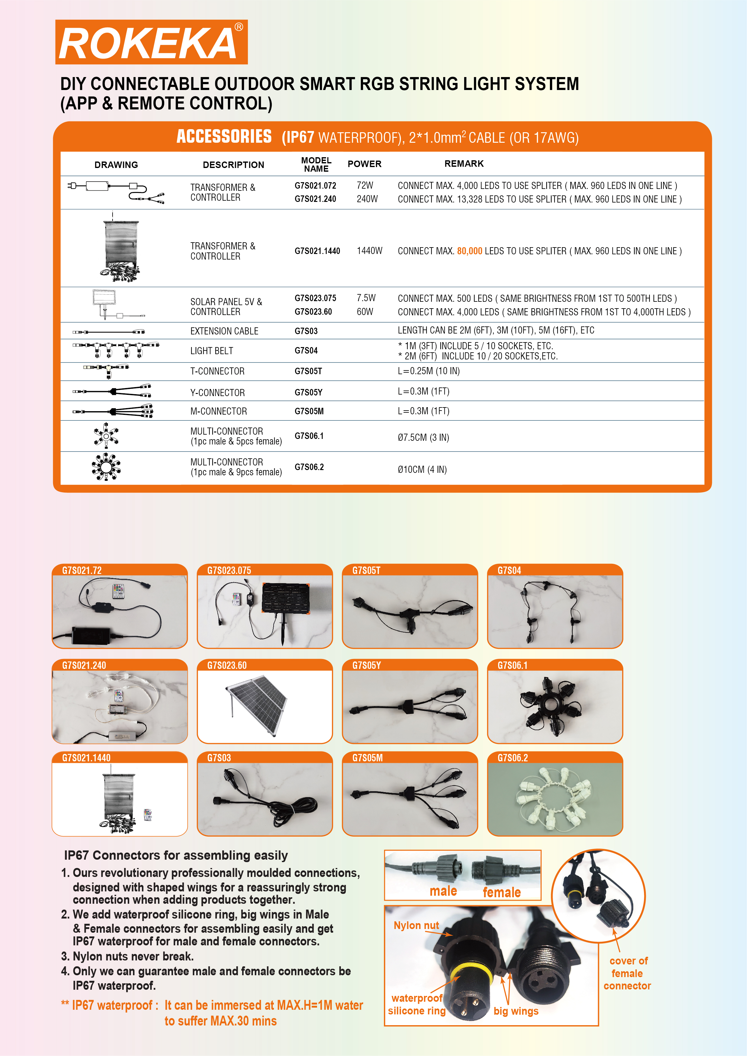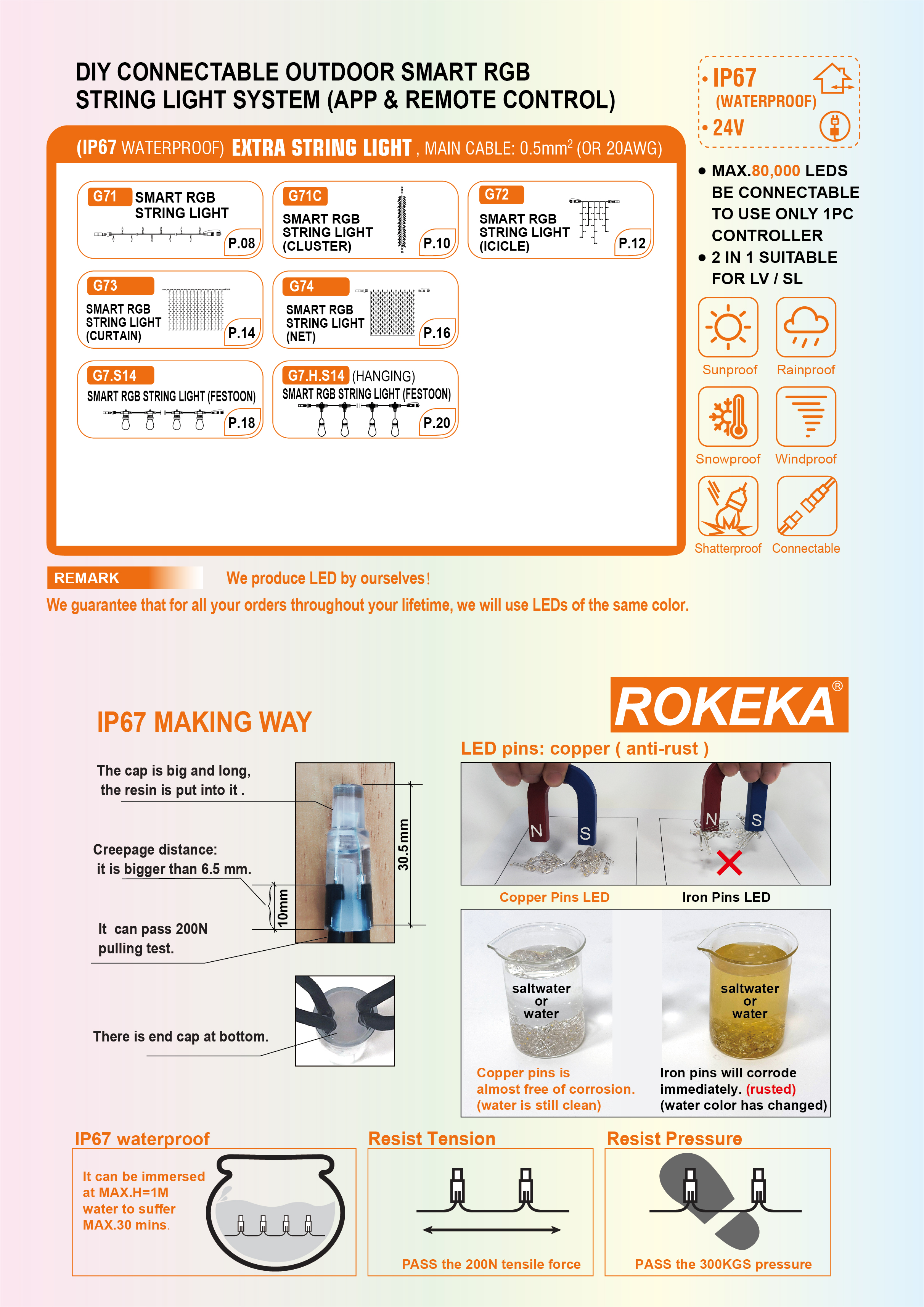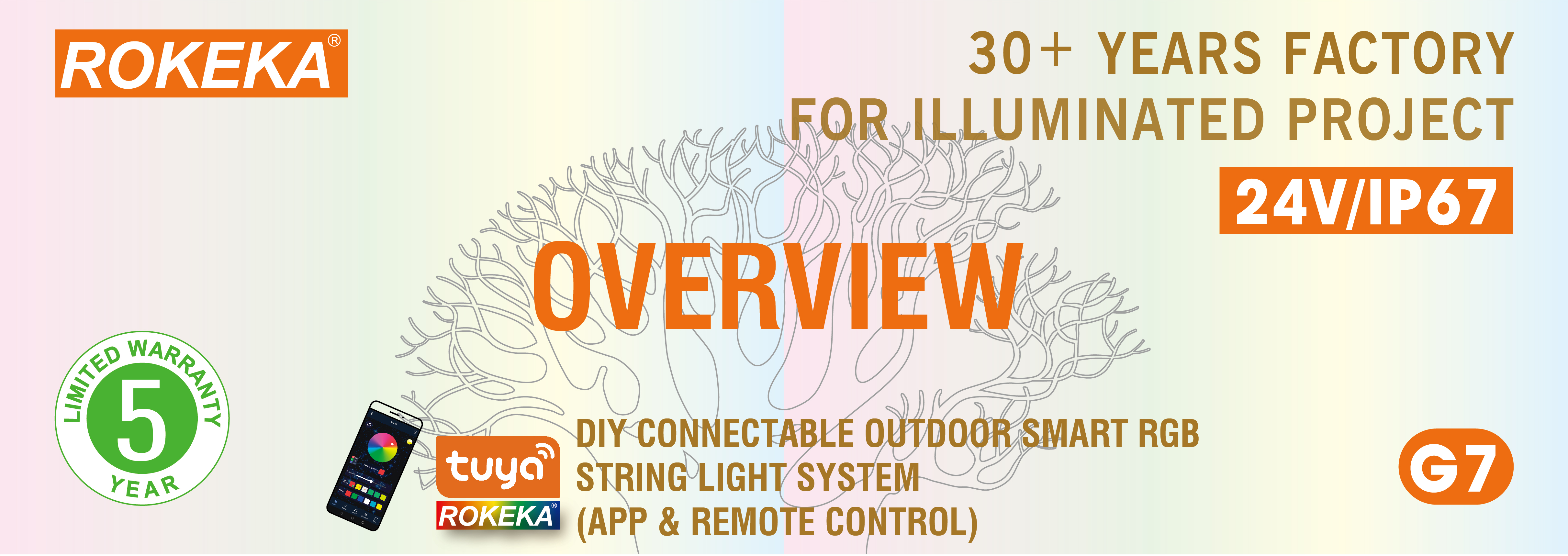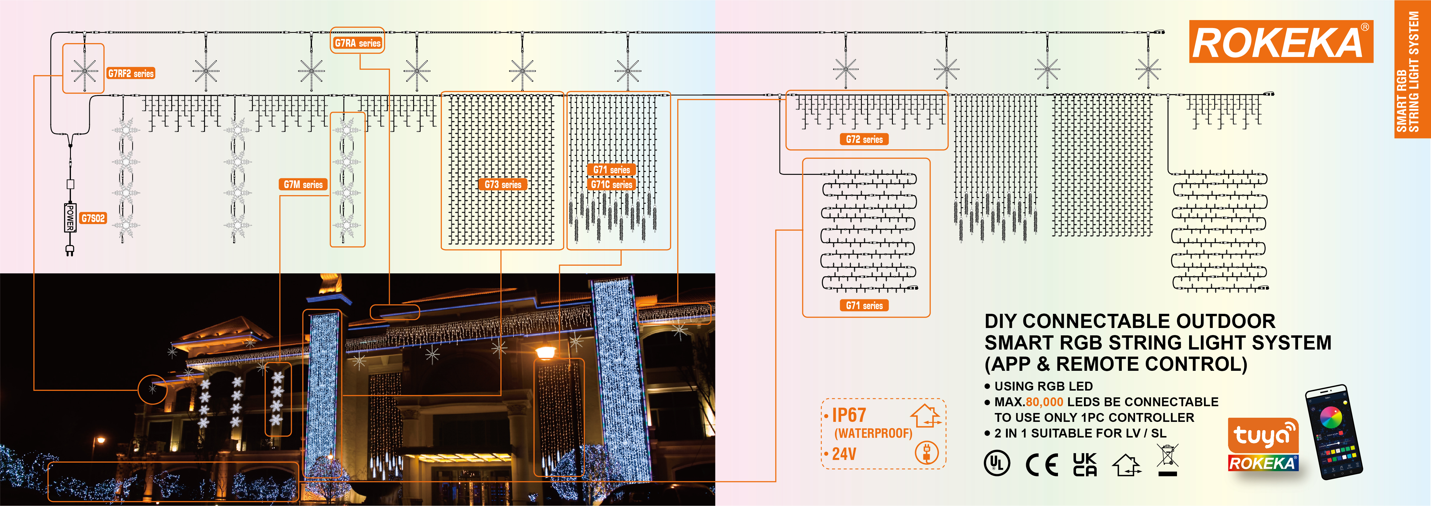 CONNECTABLE PRO (G7) is our flagship connectable lights system. It is a DIY connectable outdoor smart RGB string light system, controlled by the TUYA-ROKEKA APP (WiFi and Bluetooth dual-mode), with 16 million+ colors and 700+ scenes to choose from. Combining incredible durability with a competitive price, it is generally regarded as ideal for commercial lighting displays. Of course, it is also the preferred system for many people setting up domestic lighting displays, thanks to its ease of use and robust, high-quality components.